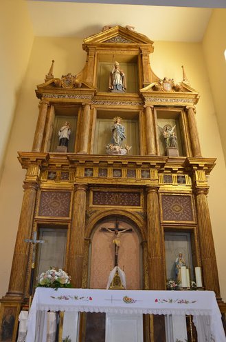 -El retablo del altar mayor, pieza Barroca clasicista, dorado con tres cuerpos con tres cuerpos