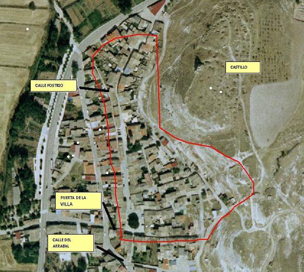 A partir de su posible origen musulmán, la población creció alrededor de la ladera en cuya cima se encontraba la fortaleza posiblemente estuviera amurallada, pues así lo indica la toponimia, ya que mirando a poniente nos encontramos con la “Puerta de la Villa”, delante de la cual se encuentra la “Calle del Arrabal” en la parte sur nos encontramos un arco instalado hace unos años, que sustituyó a otro anterior, y que por la disposición urbanística, podría tratarse de una entrada secundaria, y hacia el norte discurre la “Calle del Postigo”, quedando cerrado el conjunto por el este con la ladera del cerro del Castillo como se puede observar en la siguiente figura