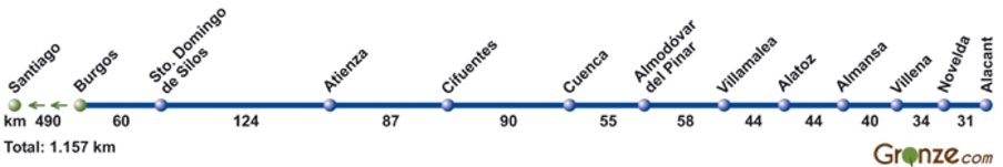 Muchos de los tramos (entre Mandayona y Burgos y entre Villena y Novelda) de este recorrido coinciden, aunque en sentido inverso, con el conocido como Camino del Cid.